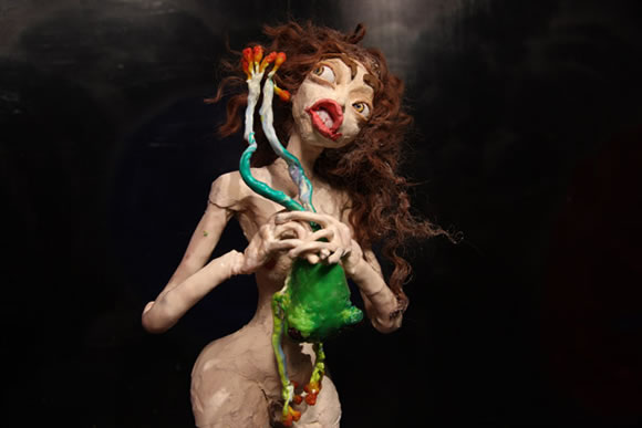Upon entering Nathalie Djurberg’s (1978) exhibition (Boijmans, 2011) one cannot avoid a sense of bewilderment. Set up around stop-motion claymation video’s of mostly naked figures dancing delightedly, flirting intimately and toying tenderly with the most gruesome of animals or each other, the exhibition seems to travel some well-trodden grounds. All too familiar themes such as sex, power and violence seem to be handled by means of a series of graphic scenes, culminating towards obscene finales. One video shows a man attempting to dance with a snake before he gets ripped apart; another clip shows innocent-looking daughters approaching their mother’s bedside to crawl back in her womb. A next animation tells the story of a young Eskimo-girl hunting for a walrus so she can disembowel the formless creature and sew herself in its skin. And yet other films show girls sensually stripping off each other’s flesh, monks and a donkey sucking dry the breasts of Rubens-like female or various insects crawling over a corpse.