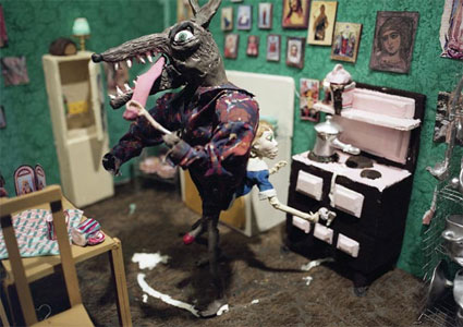As said, the videos and sculptures of the principal installation, Snakes Knows it’s Yoga, are littered with references to those otherworldly aspects of mysticism, meditation and hallucination. Men and women lose themselves in carnal pleasures and hallucinate on unfamiliar substances; faqirs meditatively ascend to the heavens, lay on a bed of nails or attempt to hypnotize a snake (or vice versa). Strikingly, her older works (2005-2010) points towards an obsession with the features of those other worlds created by fairytales, fables and folk tales. A hairy caveman turns on some girls in a dollhouse-like universe (Caveman Mike, 2008); the bodies of a giant wolf and a petite girl are symbiotically grown into one another (We are not two, we are one, 2008); a luscious female dies while being lost in a grim forest, upon which the insects dutifully decompose her body (Turn into me, 2008). Fittingly Djurberg describes her work as pagan poetry or fairy tales gone mad, nicely encapsulated by an animation of a voluptuous woman lusciously licking either a hallucinatory toad used in shamanistic rituals or a frog that is about to turn into a prince (or Caveman Mike, of course). Highly recommended!