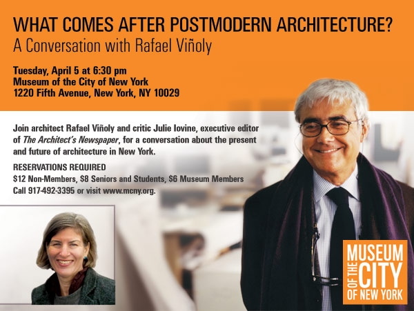 When we found out that starchitect Rafael Vinoly accepted an invitation from the Museum of the City of New York to discuss the state of architecture after postmodernism we were obviously intrigued. Somehow we were hoping that the outspoken Vinoly would offer some clues as to where twenty-first century architecture is going aesthetically and perhaps even, ethically. We hoped in vain. Although he was sporting his usual double pair of spectacles, Vinoly’s meandering remarks were lacking in focus, fresh insights and new perspectives. He was clearly at a loss. Still he made some interesting remarks about the shallowness of iconic architecture, the problem with branded identities and the return of the craftsman. You can read a full report here.