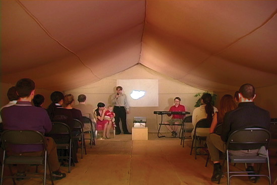 One of the artists featured in Common Love was Ronnie Bass (1976), who showcased a couple of rather captivating video-works. Bass’ protagonists inhabit the most ordinary of domestic spaces (attics, sheds, kitchens, living rooms) where they come together to devote their free time to pet projects and shared interest. In Our Land (2006) the manager of a computer store, meets up with two of his favorite employees to carve a sculpture out of a chunk of wood, their mutual hobby; in The Sky Needs You Too (2008) a couple of friends are clumsily trying to pour the contents of a bag of flour (?) into a clunky mixer and in 2012 (2009) two mates seem to conduct an elaborate experiment with a flower pot, a pile of dirt and a chemical set. Of course such pastimes are easily ridiculed – and considering the abundance of geeky clothes and cheesy music they indeed are – but in the end any ironic stance towards the activities of the characters is held in check by the overall sincerity of the works (similar to McDowell’s description of the quirky sensibility). The geeky scenes of Do It Yourself (DIY) culture are, for instance, coupled to references of sublime experiences, romantic desires and utopian longings. The cheesy music is paired to at times toe cringing, but always heartfelt and honest songs about being friends, reaching out and helping out.