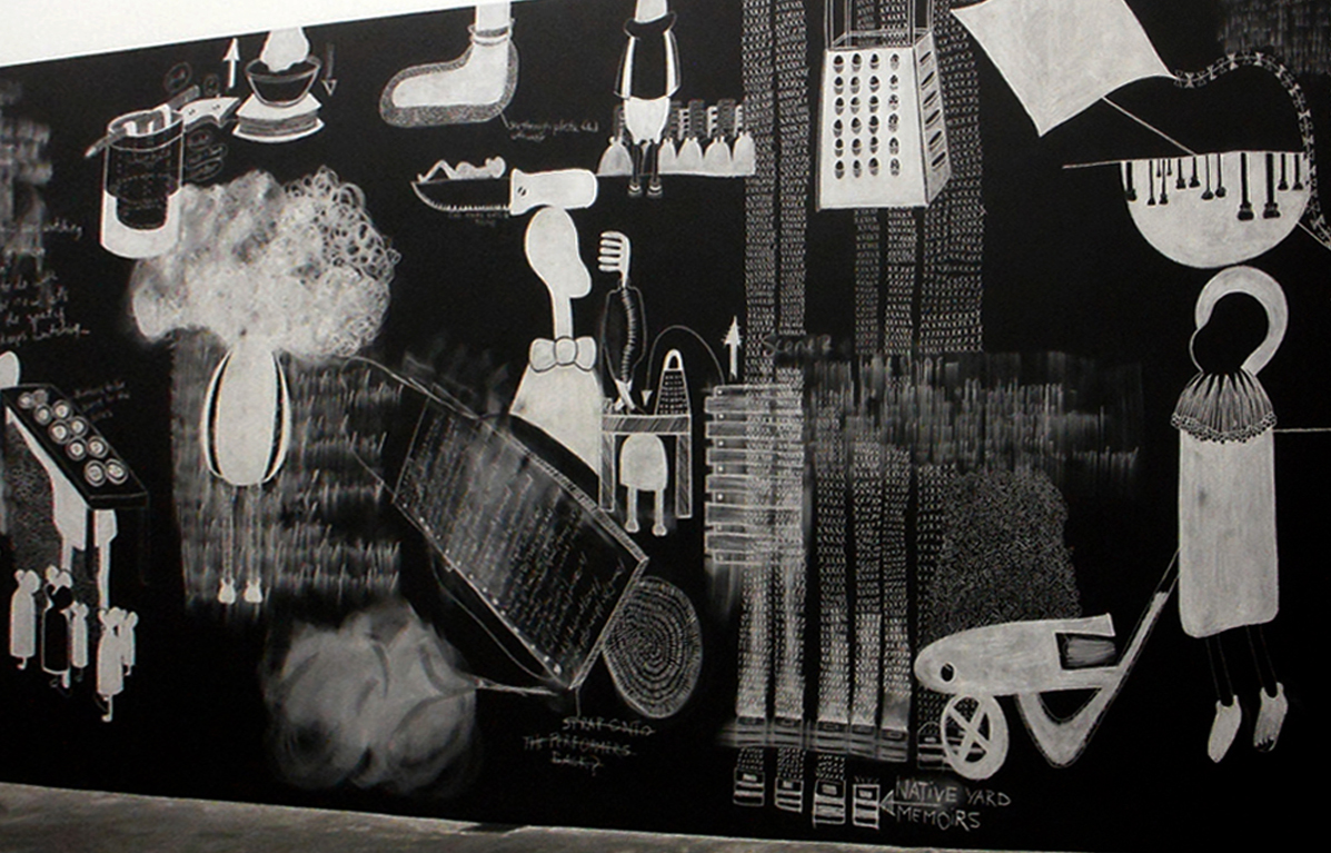 The Italian philosopher Giorgio Agamben has recently had a great deal to say about our understanding of history, especially in relation to the concept of the paradigm. Perhaps the idea of the paradigm Agamben proposes can be understood from the figure of the palimpsest – a text that has literally been written on top of another text or figuratively been built on an older original, text. This comparison becomes clearer in Agamben’s description of the paradigm. He suggests that rather than obeying the logic of the metaphorical transfer of meaning the paradigm answers to the analogical logic of the example. Essential to this is then the palimpsest as example and figure. In the work presented in the triennial by the South African artist Kemang Wa Lehulere we encounter a chalkboard where both text and imagery seems to answer to the rule of philosophical archaeology. The text that once was has been smeared out and rewritten, while the imagery of material reminiscence and remains stands out like sticks, stones and hard edged bones, implying that not only memory but also forgetfulness are contemporaneous with perception and the present.[5] Wa Lehulere’s work speaks of the complex inheritances of post-apartheid South Africa. However, if we look at the figure of the palimpsest the term is also used to describe augmented realities brought about by the melding of layers of material places and their virtual representations – in this way the artwork expresses a truly palimpsestic quality. In some way Wa Lehulere’s piece becomes more than just a reflection on power relations and the constructed memory of historical events: the palimpsestic quality of the artwork makes it able to carry an allegorical intent that not only refers to the figure of the palimpsest as an allegory of an allegory—but also as an allegory of memory that is referring to our present form of reflection and understanding as well as the destructive forcefulness of forgetting.