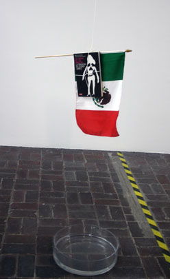 Mockus’s corresponding installation, Blood Ties (2012) works with PM 2010 by questioning the notion of action against a specific context that spans the local-global divide. The installation comprises of a Mexican flag tied to two books – J.L. Austin’s seminal How to Do Things with Words (on the performative utterance as a productive act), and La Ciudad de las Muertas: la Tragedia de Ciudad Juárez, written by Marc Fernandez and Jean-Claude Rampal. Hung from the ceiling and attached to a machine that lowers the objects some fourteen centimeters daily, apparently over a tub of acid, an attendant sits at a desk nearby with a pile of certificates that pledge whoever signs one will refrain from taking drugs for the duration of BB7. In signing the declaration, one could press a button that would raise the flag by three millimeters.[9] Viewers could also donate blood at a nearby hospital in return for pushing the button fifty times.