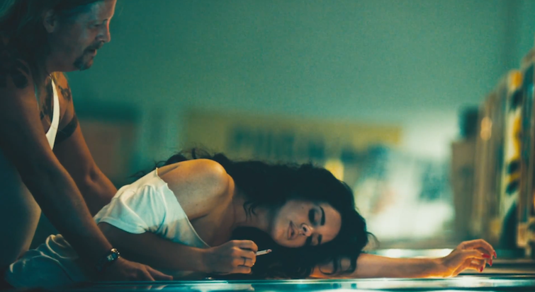 Some bikers on choppers pick her up after a while. Later we see them riding on long roads through the desert, Del Rey as a pillion passenger, her long hair flowing behind. In other scenes, the bikers ride through a campfire, drink alcohol and play with guns. Del Rey now wears a Native American feather headdress and holds the Star-Spangled Banner. “I’m tired of feeling like I’m fucking crazy,” says the singer in the epilogue, voiced-over images of the campfire scene, and then she ends: